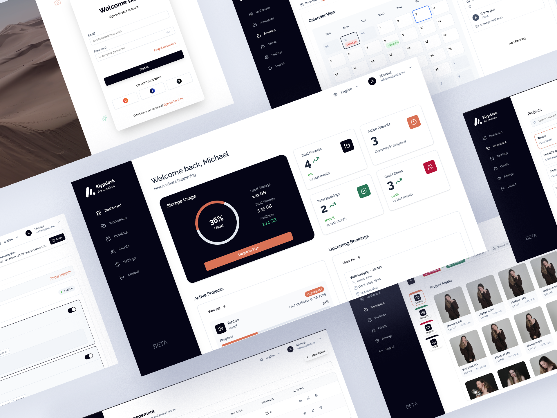 A SaaS platform designed for creatives (photographers and videographers) to streamline project management, client collaboration, media delivery, and bookings system. The platform enables creatives to present their work professionally, manage client feedback, and organize bookings—all in one cohesive interface.
